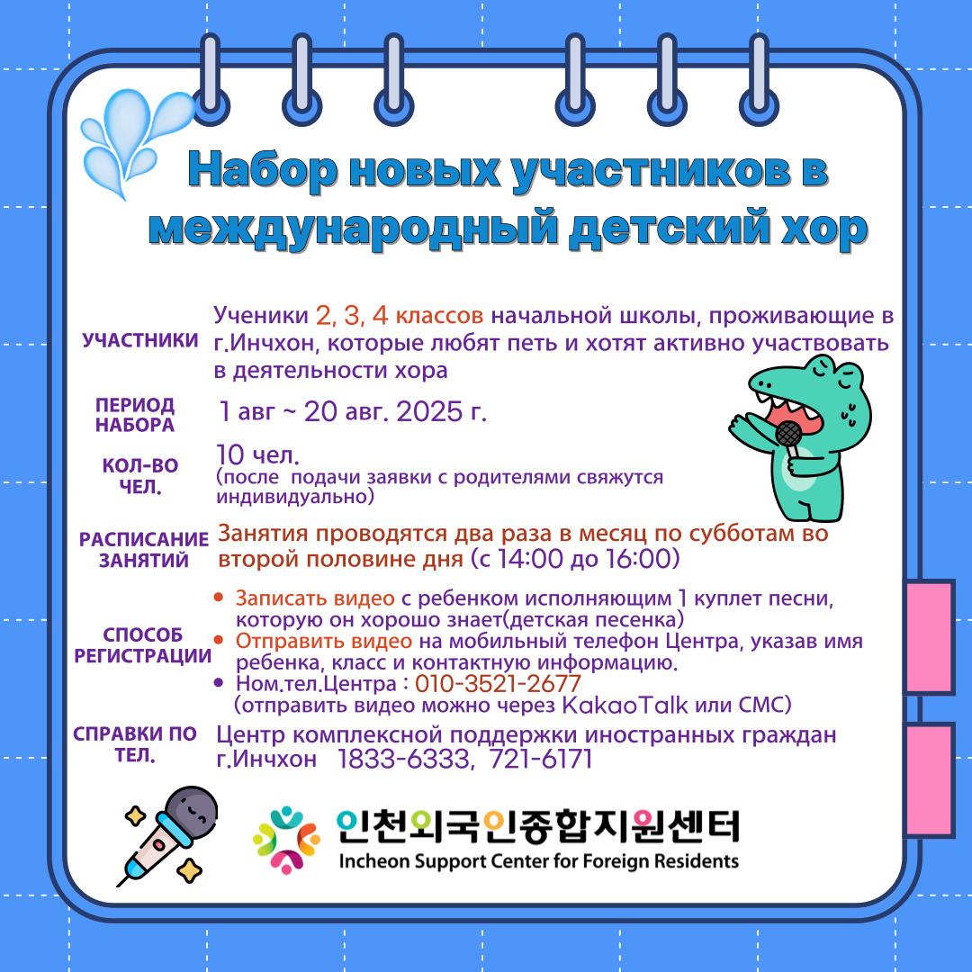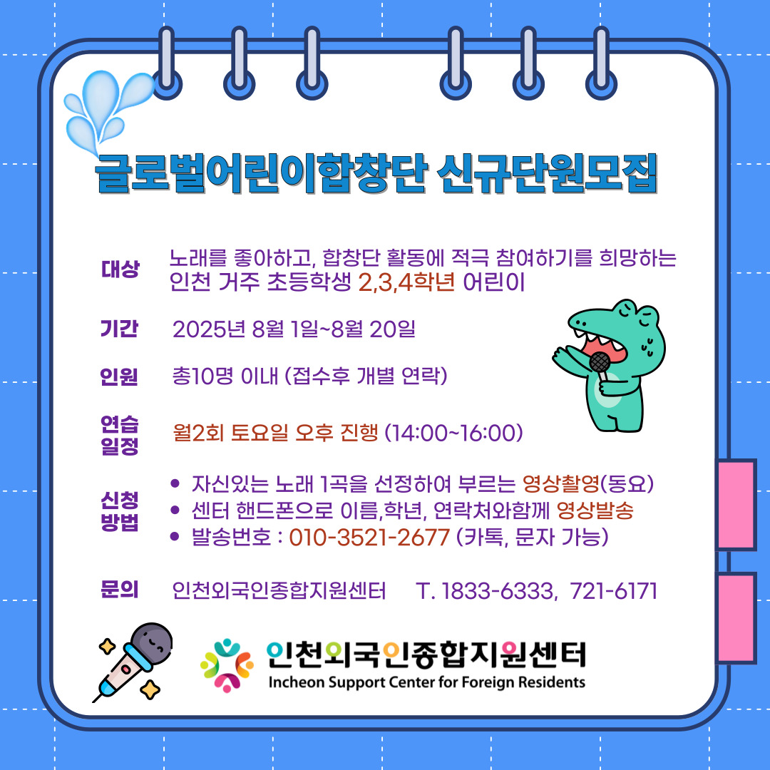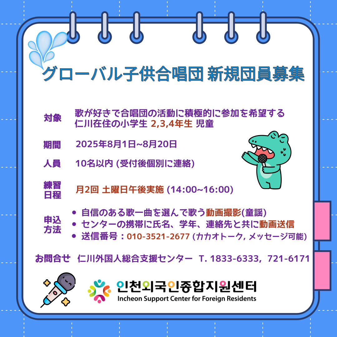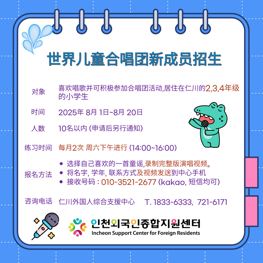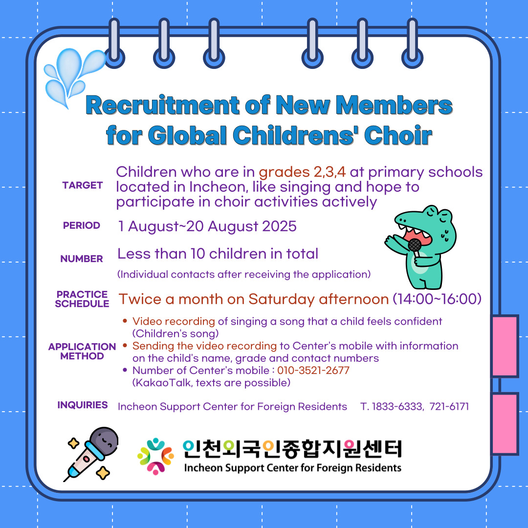 모집대상 : 노래를 좋아하고 합창단 활동에 적극 참여하기를 희망하는 인천거주 초등학생 2,3,4학년 어린이